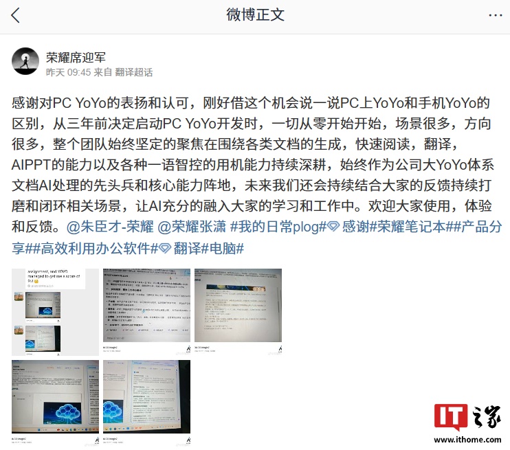 据IT之家此前报道,今年 2 月,荣耀 PC 产品线总经理 @朱臣才-荣耀 发布视频介绍了由 MagicBook Pro 14 笔记本首发的 PC 端 YOYO 助理 2.0 应用: