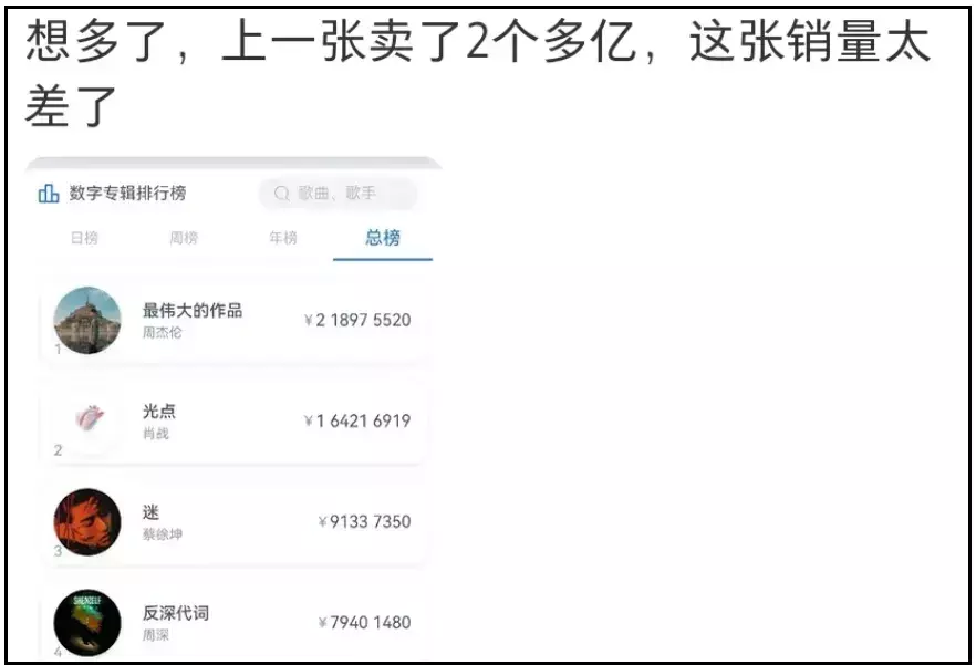 不是说《最伟大的作品》卖了太多的意思,而是因为《最伟大的作品》的出现,让许多网友不再闭眼买周杰伦的专辑了。