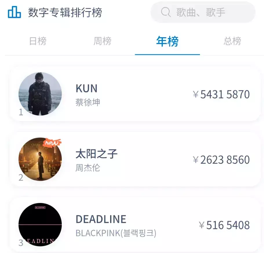 2026年过去三个多月,选秀出身的流量歌手蔡徐坤稳居专辑销量榜第一,他于2026年2月推出新专辑《KUN》,已经卖出了176万张,销售额突破5400万。