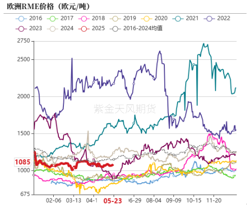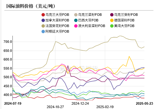 截至2025年5月23日,国际主要油料中,乌克兰和德国菜籽价格上涨,大豆价格小幅走弱。