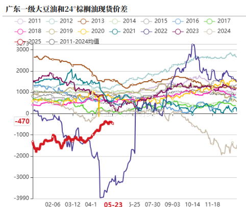 截至到5月23日锦盈多,印度港口毛豆油和毛棕榈油价差60美元/吨,前周130美元/吨。